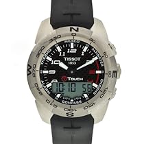 Titanium case with a black rubber bracelet. Bidirectional rotating titanium bezel. Black touch screen dial with luminous hands and both stick and Arabic numeral hour markers. Quartz movement. Scratch Resistant Sapphire crystal. Case diameter: 43 mm. Casae thickness: 14.8 mm. fold-over-clasp-with-double-push-button-safety. Water resistant to 30 meters / 100 feet. Other features include: Perpetual Calendar LCD backlight 2nd time zone Barometer Altimeter Compass Thermometer. Tissot T-Touch Expert Titanium Analog/Digital Mens Watch T013.420.47.202.00.